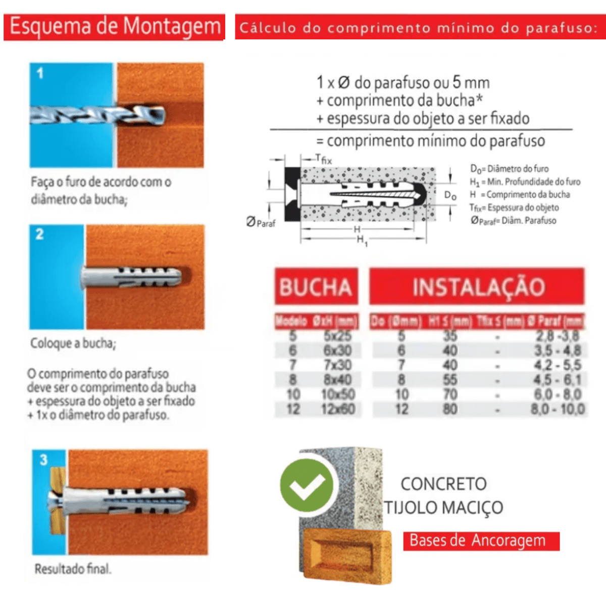 O comprimento do parafuso deve ser o comprimento da bucha mais a espessura do objeto a ser fixado.