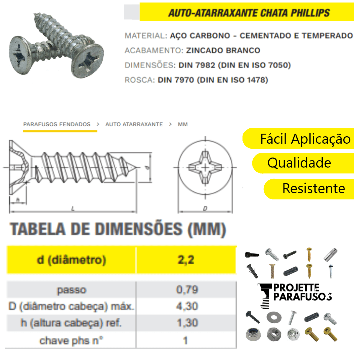 Parafuso Auto Atarraxante Cabeça Chata 2.2 X 6.5 mm Phillips Pacote com 100 peças