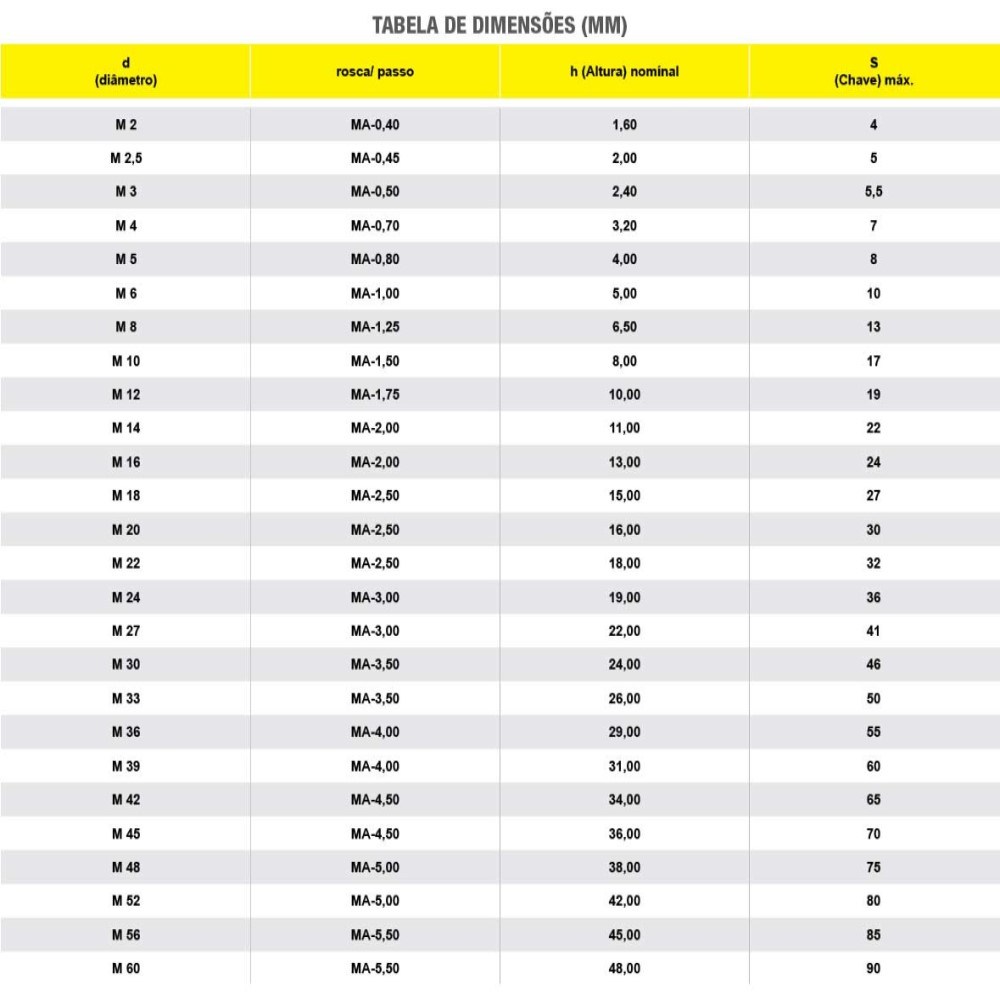 - Tipo da rosca da porca: MA